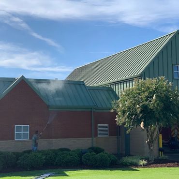 A solution is sprayed to soak off the dirt and algae and then we rinse it off very carefully